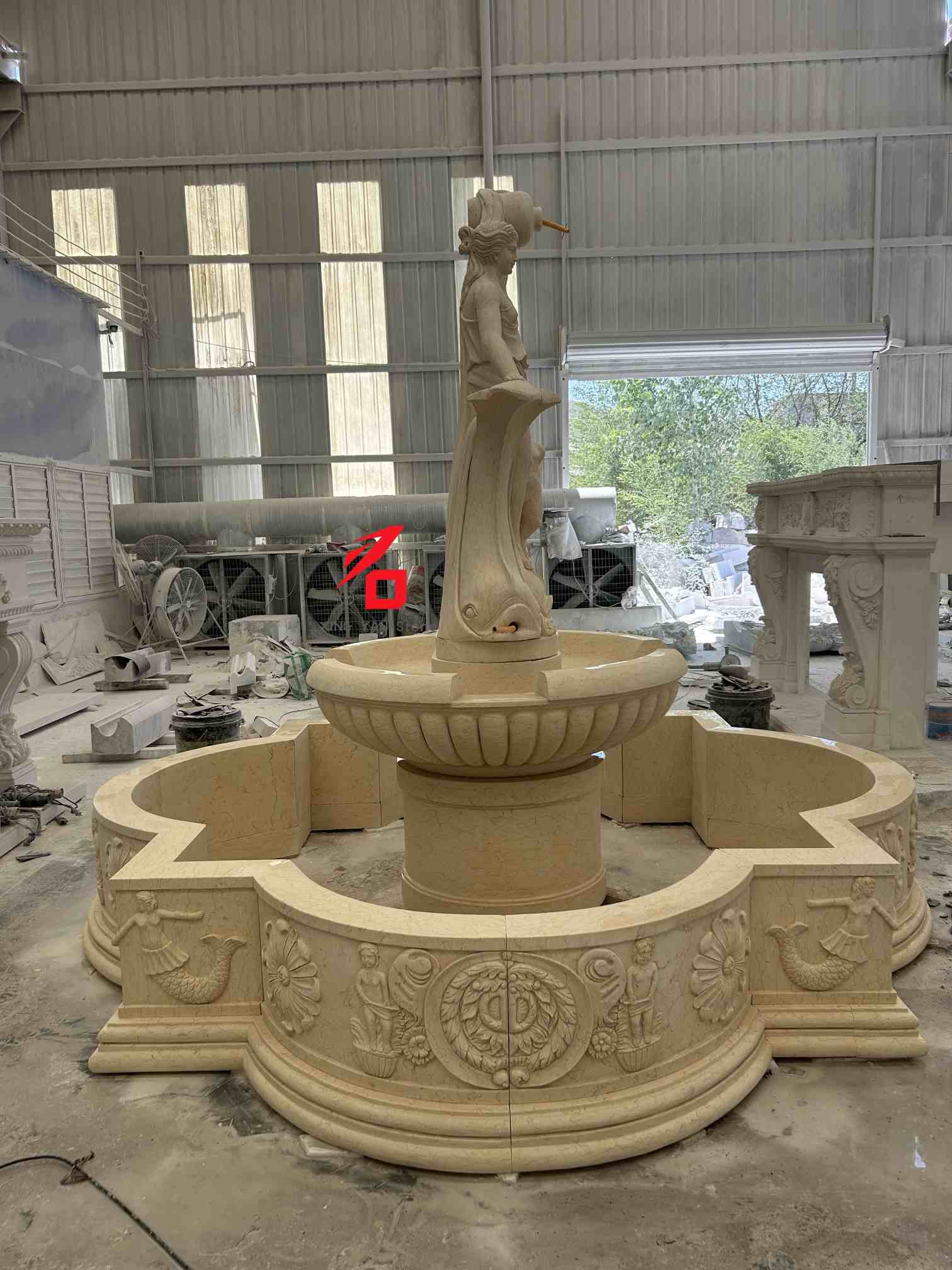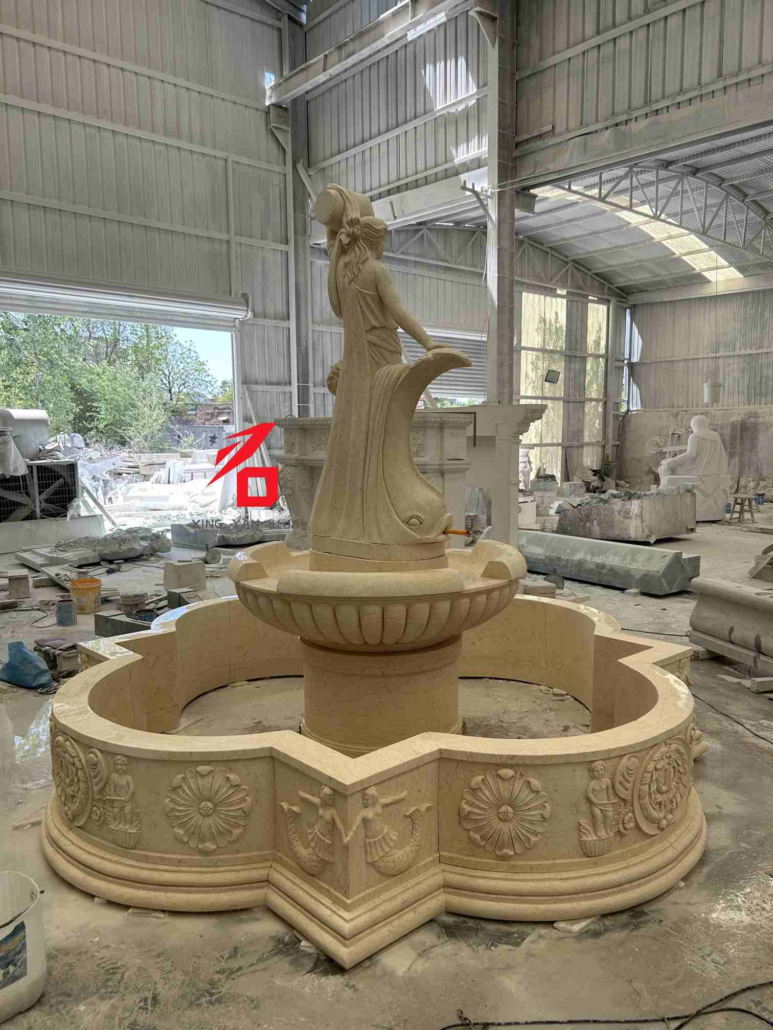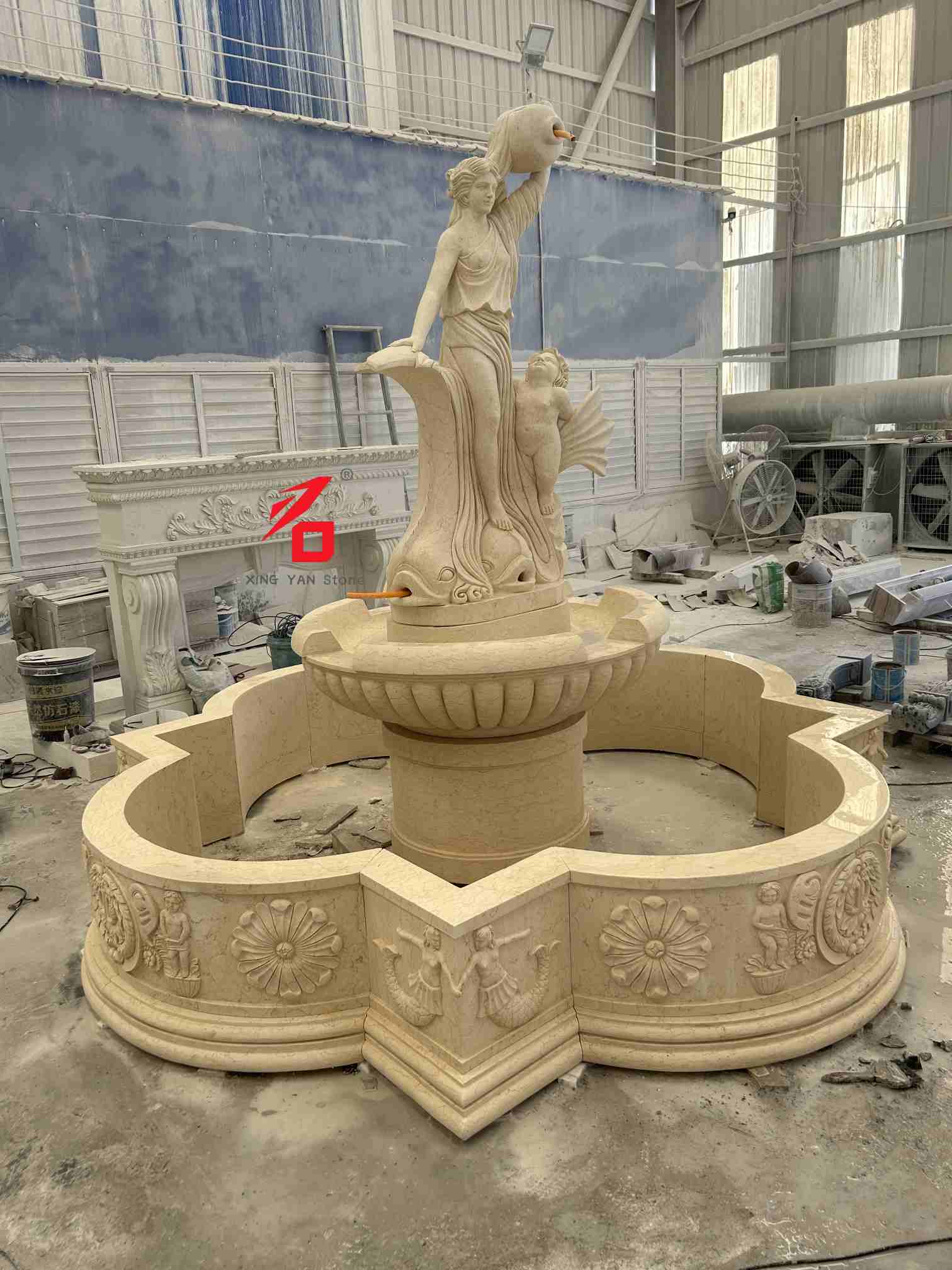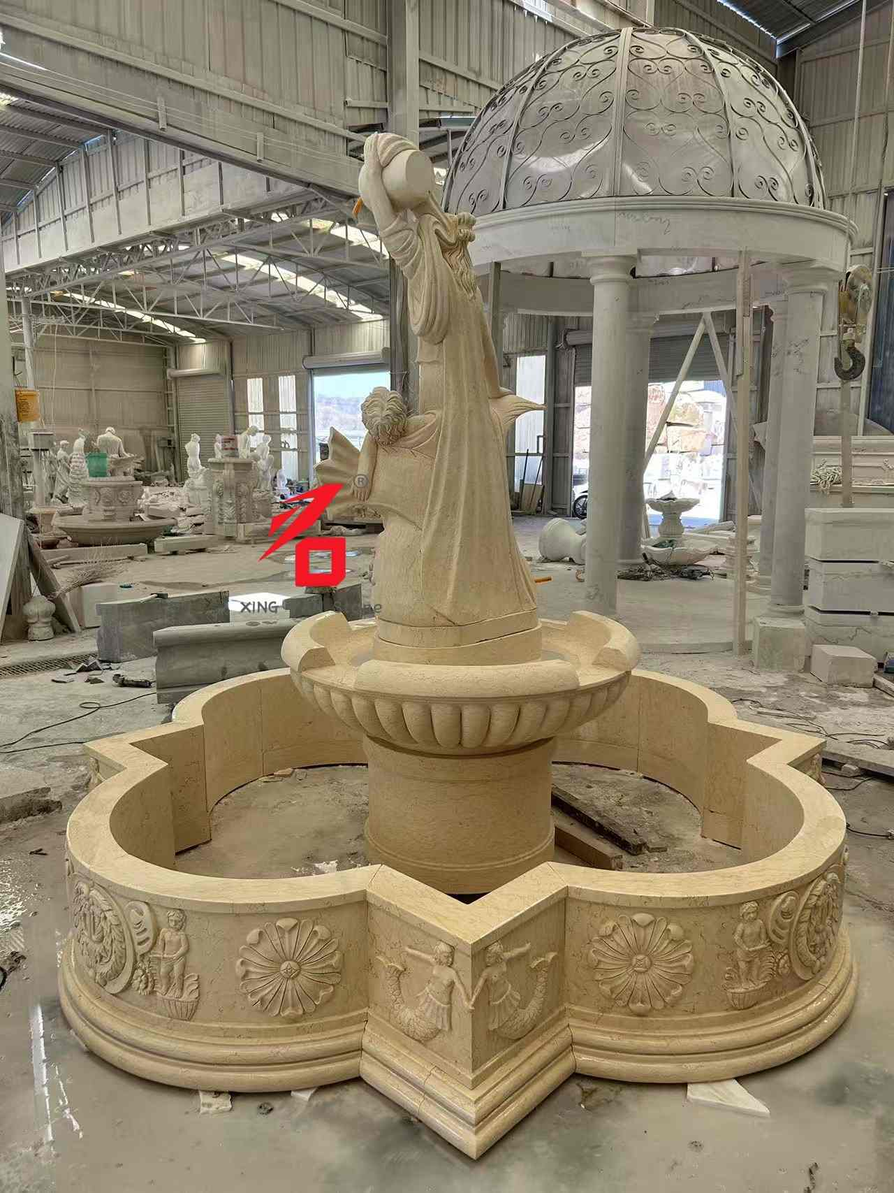 ढुङ्गा विकल्पहरू: अनुकूलन ढुङ्गा विकल्पहरूमा बेज संगमरमर, सेतो संगमरमर, बलौटे ढुङ्गा र अन्य प्राकृतिक ढुङ्गाहरू समावेश छन्। ढुङ्गाको राम्रो बनावट, न्यानो रंग, र बलियो मौसम प्रतिरोधले झरनाको स्थायित्व र दीर्घकालीन बाहिरी प्रयोगको लागि सौन्दर्य अपील सुनिश्चित गर्दछ। नक्काशी शिल्प कौशल: परम्परागत हात-नक्काशी प्रविधिहरू प्रयोग गर्दै, अनुभवी मूर्तिकारहरूले सावधानीपूर्वक देवीको अनुहारको अभिव्यक्ति र ड्रेपरीदेखि बच्चा र माछाको आकारका गहनाहरू, कलात्मक बनावट र युरोपेली शास्त्रीय मूर्तिकलाको त्रि-आयामिकता प्रदर्शन गर्दै हरेक विवरणहरू बनाउँछन्।