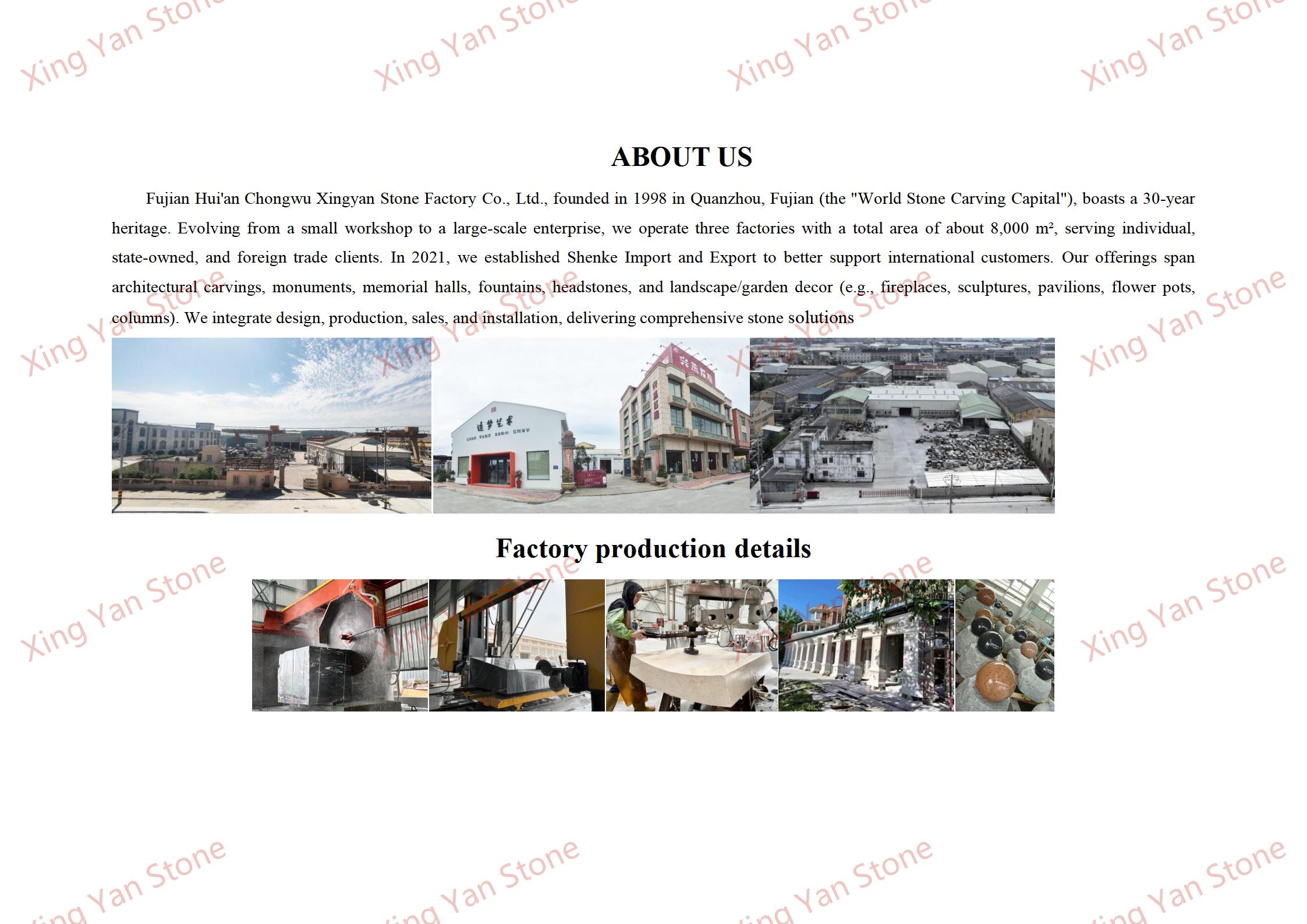 सामग्री: चयन गरिएको बहु-रंग ग्रेनाइट टुक्राहरूबाट निर्माण गरिएको। सेतो र रातो-खैरो ग्रेनाइट कडा र रंग-स्थिर छन्। पालिस गरेपछि, सतहमा उच्च चमक हुन्छ र लामो समयसम्म बाहिरी वातावरणमा यसको आकार र रंग कायम राख्न सक्छ।